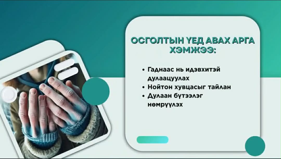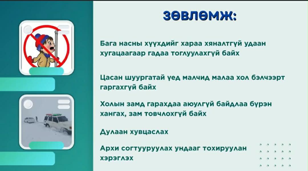 Ихэнх нутгаар цас орж, цасан шуурга шуурч, хүйтний эрч эрс чангарах тул осголтоос сэргийлэх дараах зөвлөмжийг хүргэж байна.